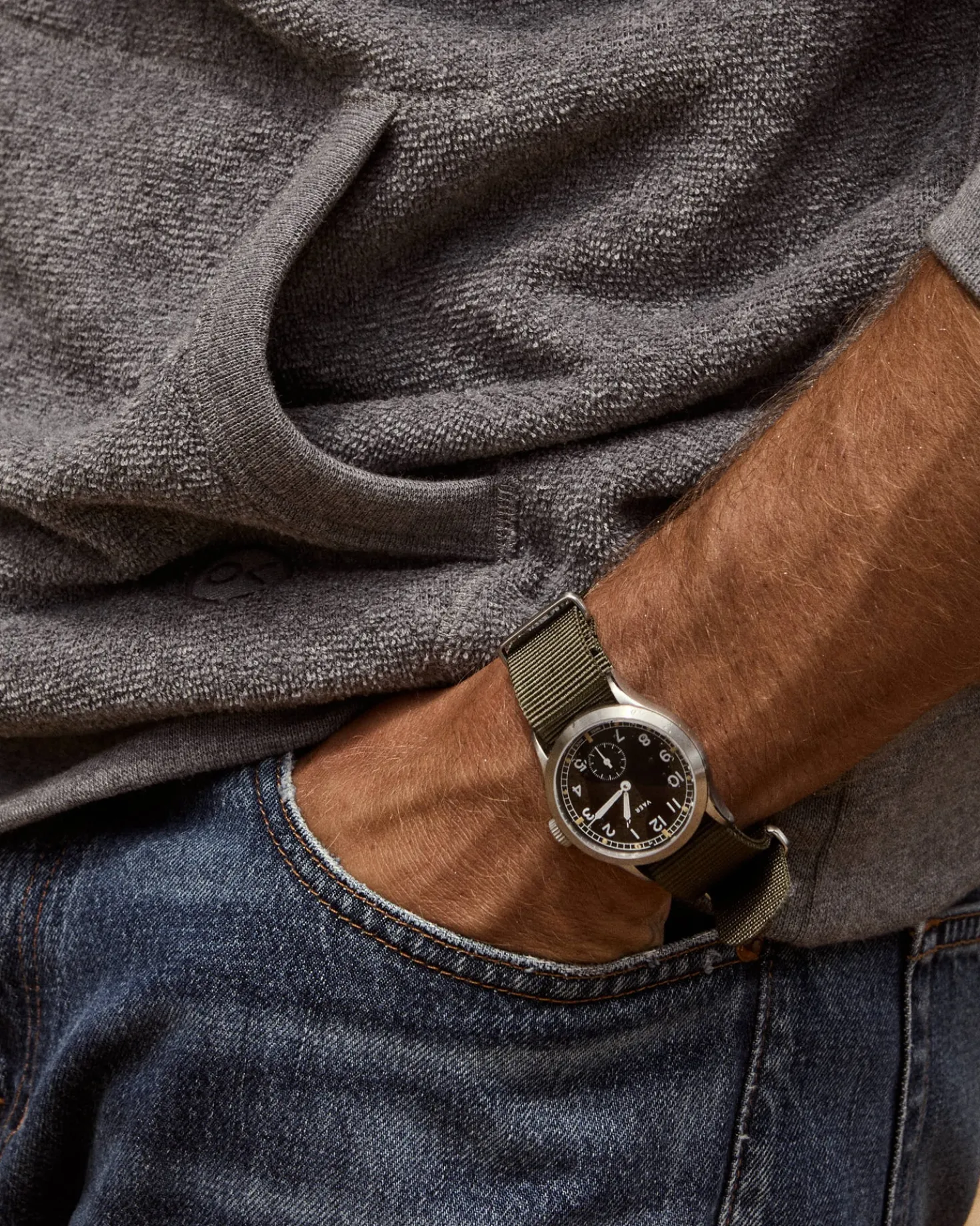 Like its 12 military forbearers, which wore the marking W.W.W. For Waterproof Wrist Watch, the A12 Dirty Dozen is perfectly suited for underwater activity. The caseback and crown use a threaded screw-down design that maintains an airtight seal, making the watch functionally waterproof. Importantly, unlike most ocean-rated watches, our Swiss Made Automatic is also incredibly slim and comfortable on the wrist, boasting a 36mm diameter.