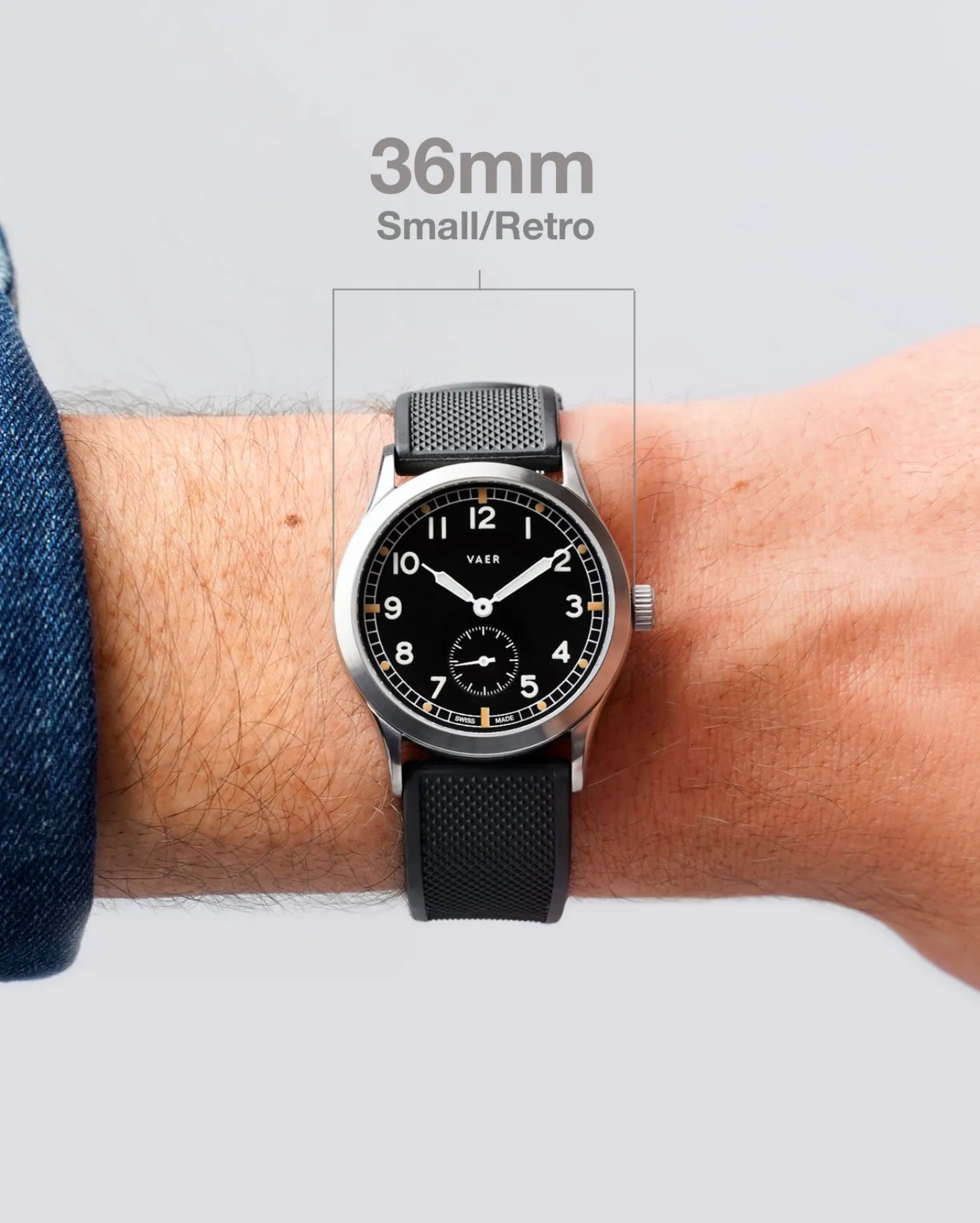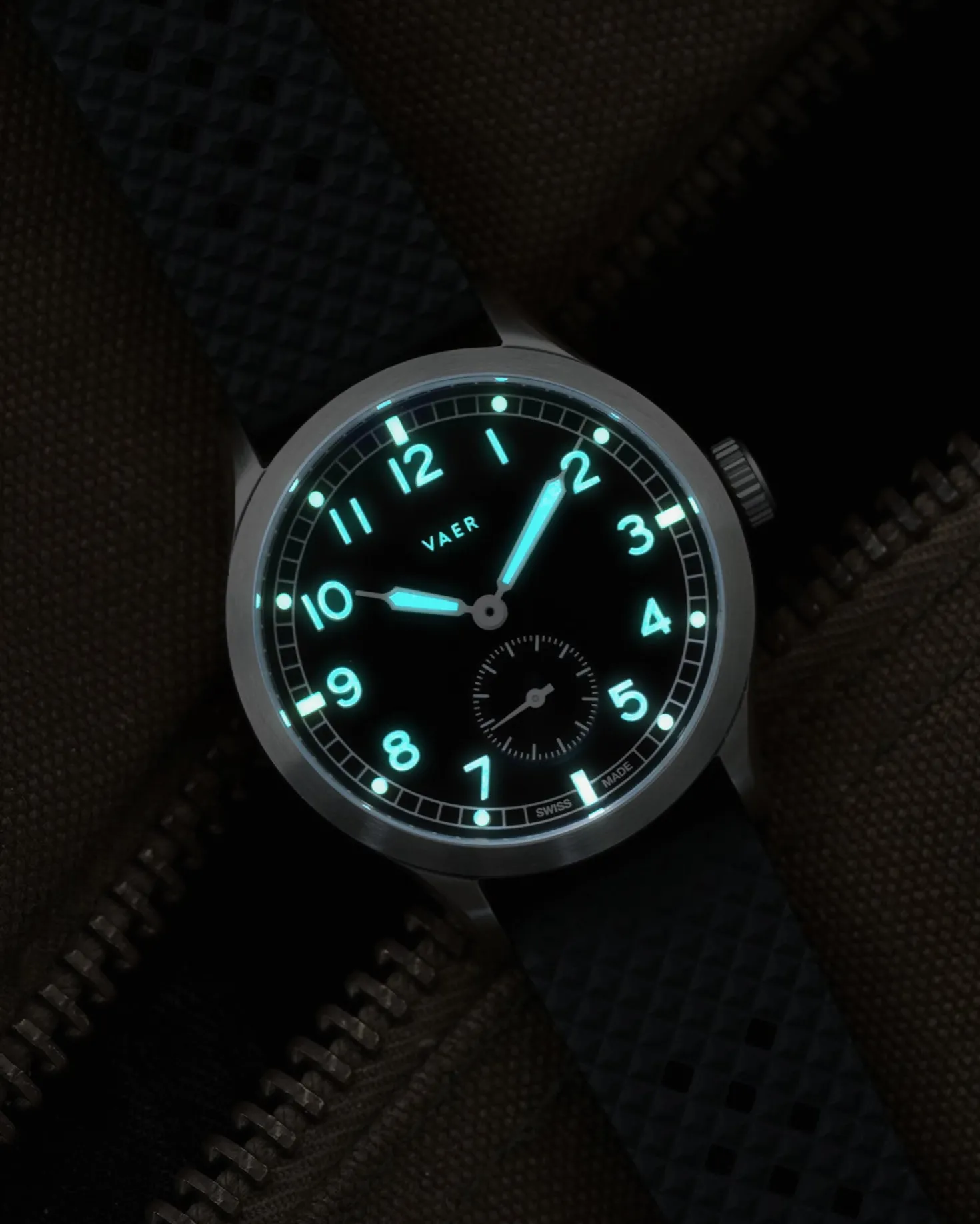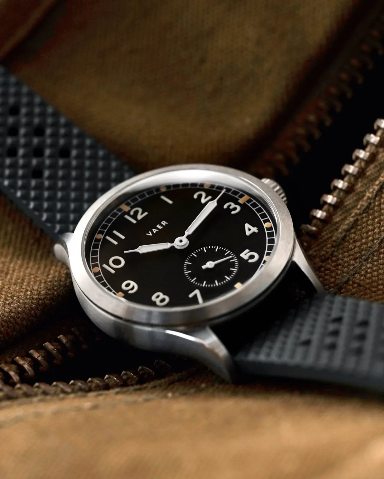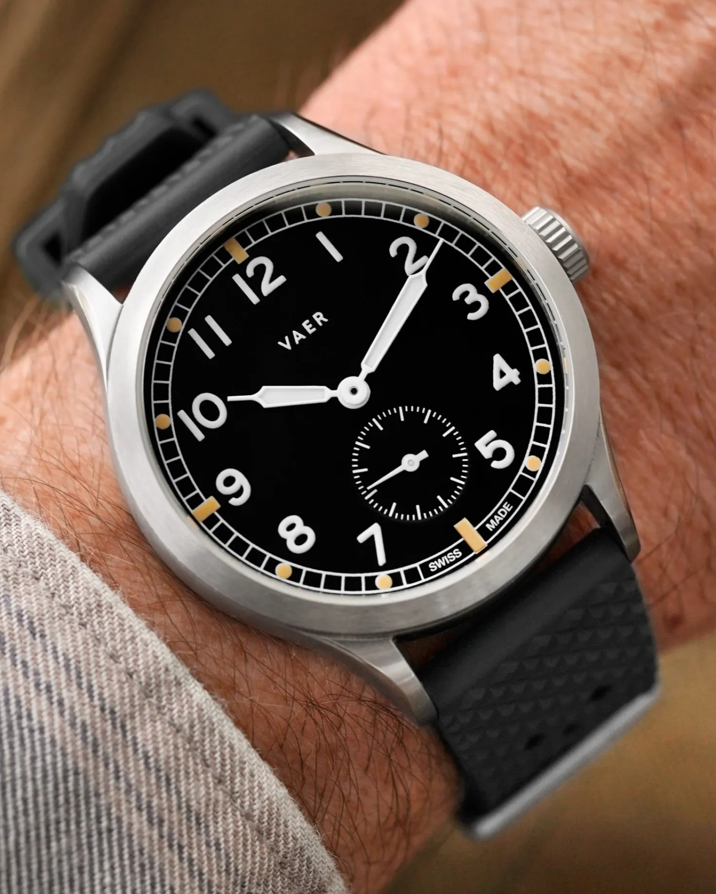 Our decision to pursue Swiss manufacturing for the A12 was motivated by our goal to create a respectful homage to the Swiss Made ""Dirty Dozen"" military watches of World War II. Functional, attractive and historically relevant, the Vaer Dirty Dozen represents not only a continued investment in timeless, durable design but also our deep respect for the history of horology.